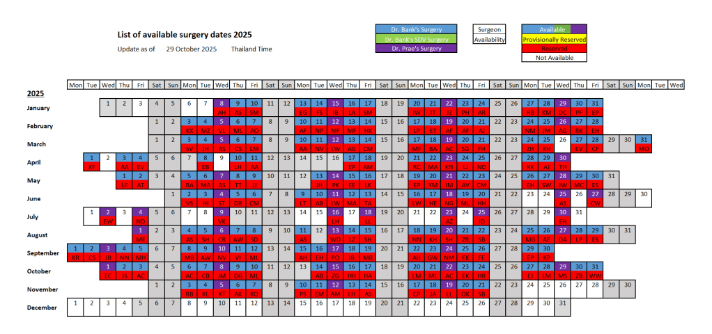 - We will post our availability from JANUARY to APRIL 2027 for surgery with Dr. Bank and from MAY to AUGUST 2026 for surgery with Dr. Prae on Friday, 16 January 2026 at 11.00am in the morning, Thai time.