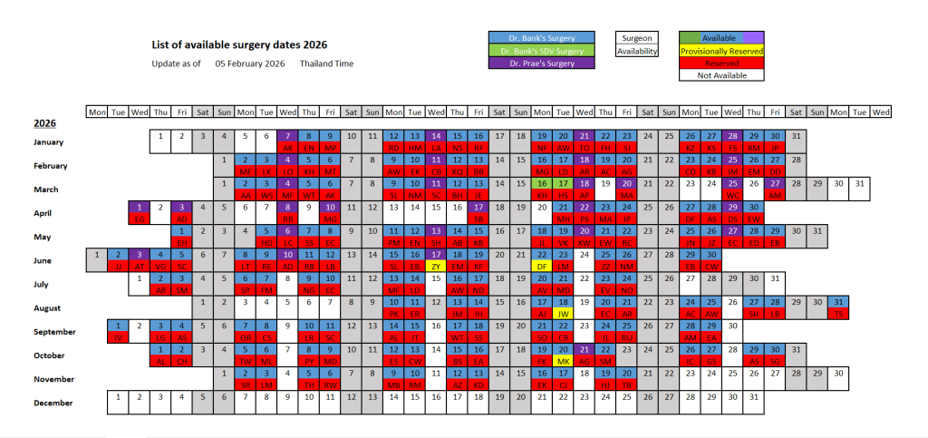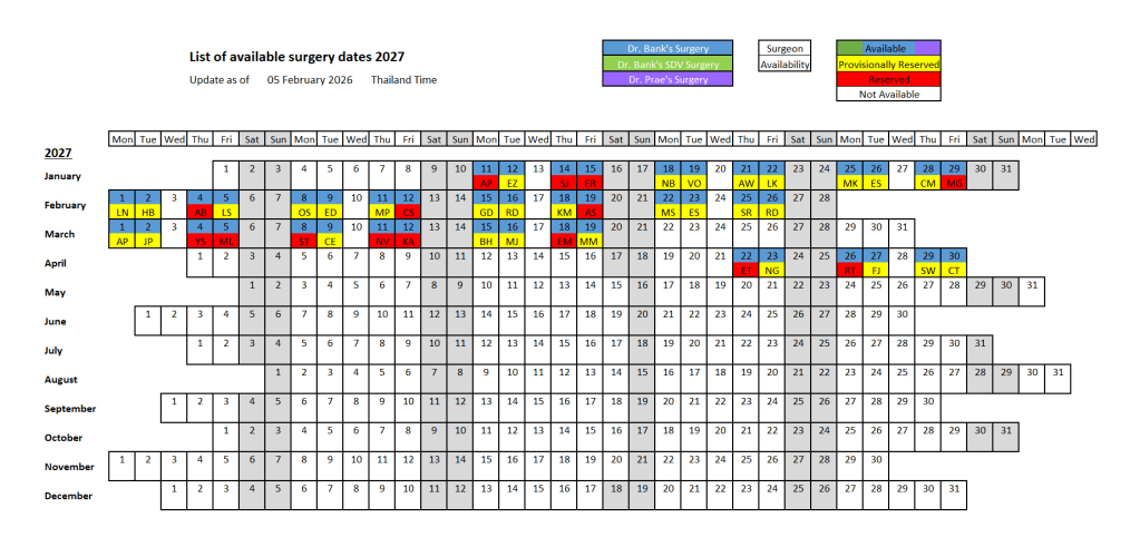 - We will post our availability from MAY to AUGUST 2027 for surgery with Dr. Bank and from JUNE to SEPTEMBER 2026 for surgery with Dr. Prae on xx May 2026 at 11.00am in the morning, Thai time.